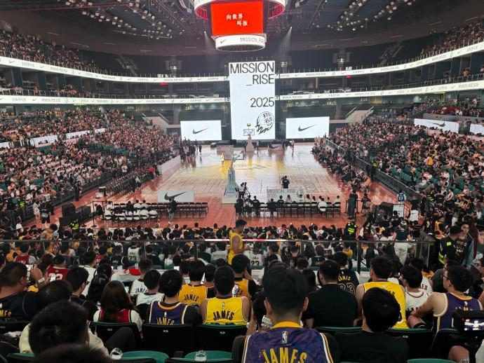 在下午的时候,詹姆斯曾与中国男篮队长赵睿一同观看了国青男篮的训练。在结束了这一部分的活动后,詹姆斯下一站启程来到成都高新体育馆,进行线下活动。据博主“詹姆斯吧官方微博”社媒消息,成都高新体育馆在詹姆斯到来前已经人山人海,几乎座无虚席,现场方面也已经做足了准备。